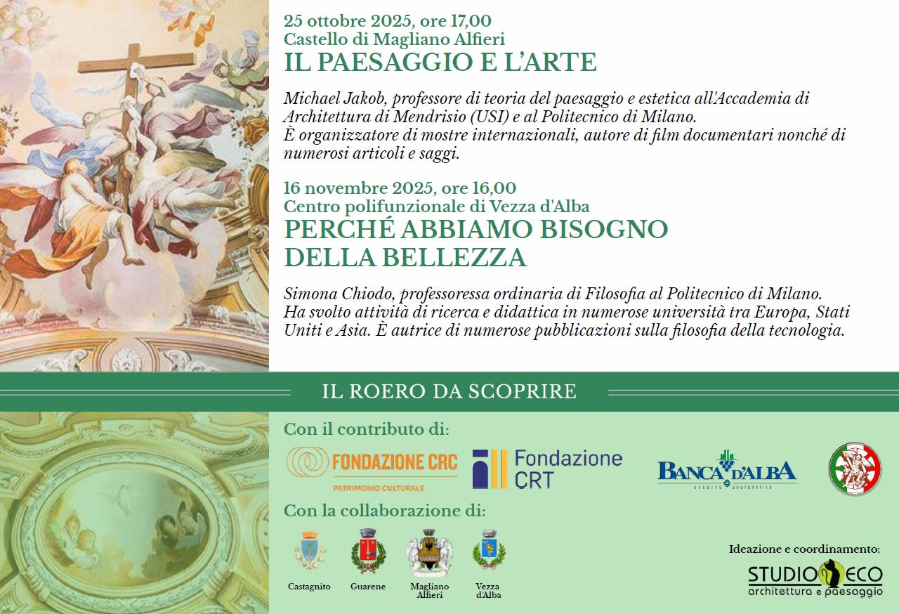 L’iniziativa, ideata e organizzata da StudioEco Architettura e Paesaggio con il sostegno del Comune di Magliano Alfieri – capofila del progetto – e realizzata grazie al prezioso contributo di Fondazione CRC, Fondazione CRT, Banca d’Alba e Ordine dei Cavalieri di San Michele del Roero, si inserisce nel contesto di un autunno ricco di incontri, riflessioni e scoperte.
