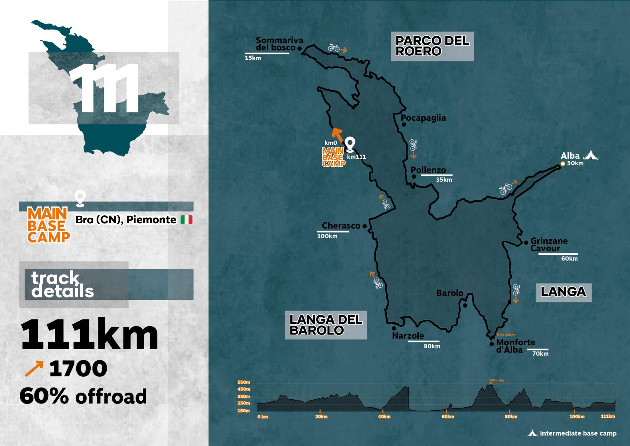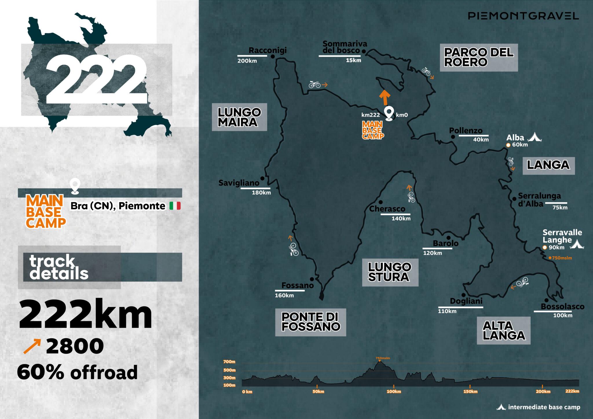 Partenza e arrivo dei quattro percorsi (il 111, il 222, il 333 e il 444) saranno a Bra (Cn), presso Villa Moffa, splendido palazzo dei primi del Novecento immerso nel verde, che ospiterà il main base camp dell’evento con stand di sponsor e partner e dove gustare i prodotti tipici del territorio.