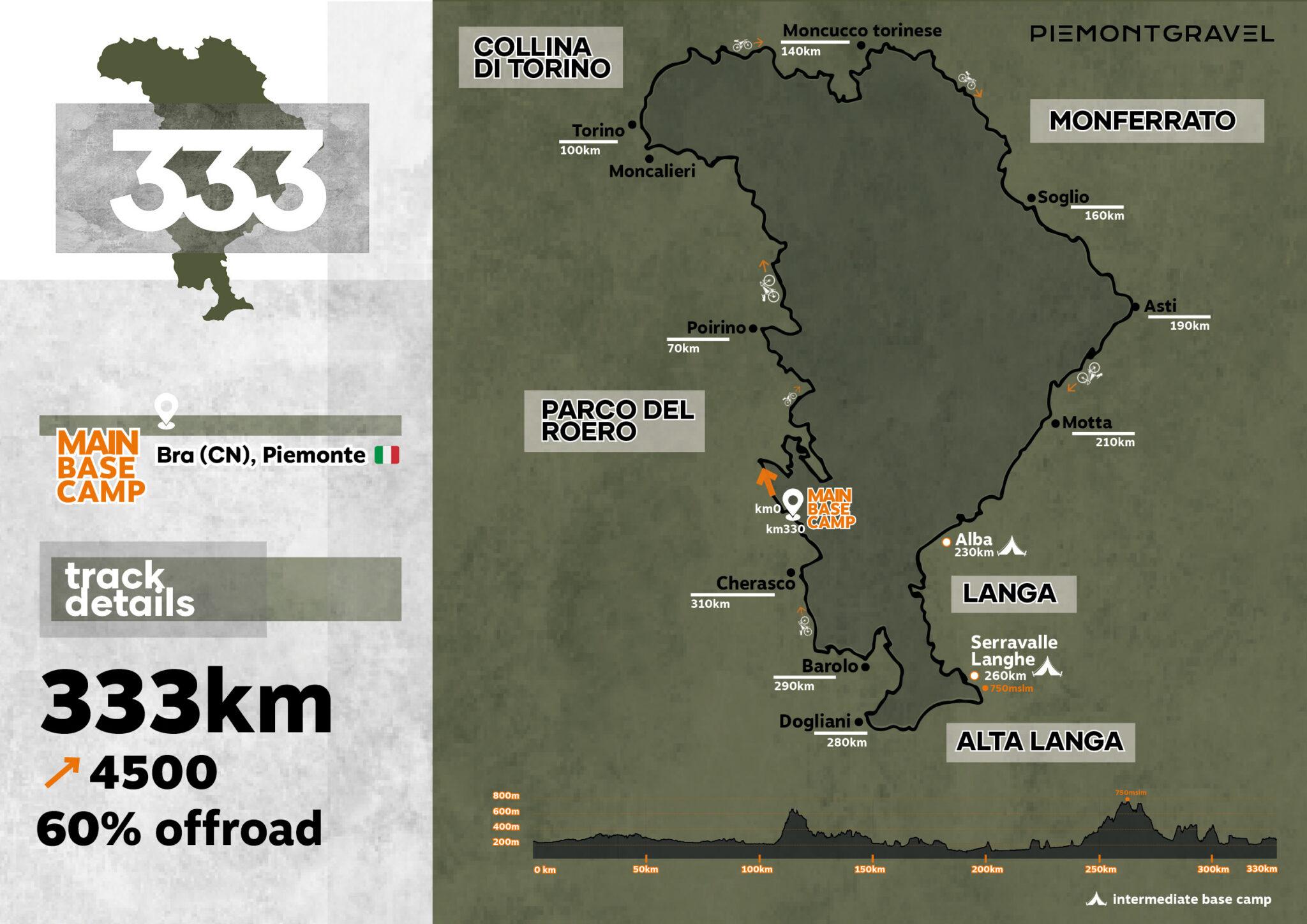 il 333: Un viaggio completo attraverso le Langhe, il Roero e le colline torinesi. Dal castello di Racconigi si prosegue verso il Colle Don Bosco e le panoramiche Rocche del Roero, per poi rientrare verso le colline di Alba. 330 km – 4.500 m D+