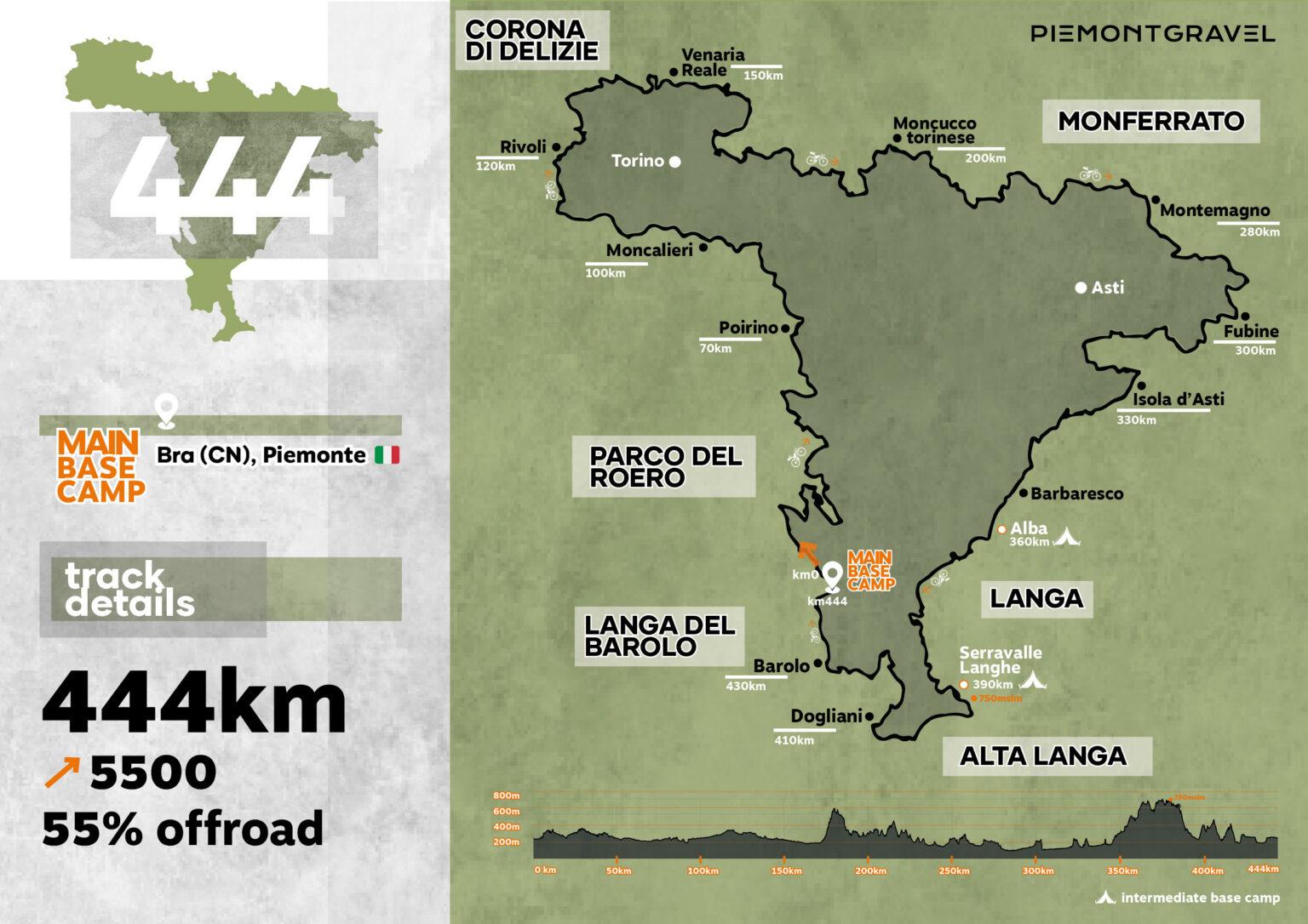il 444: Il tracciato più lungo e avventuroso, pensato per i grandi pedalatori. Dopo il Roero e il Monferrato, raggiunge Torino percorrendo le ciclabili lungo il Po nel Parco del Valentino e regala scorci unici sulle Prealpi Cozie prima del ritorno verso la Langa. 444 km – 6.000 m D+